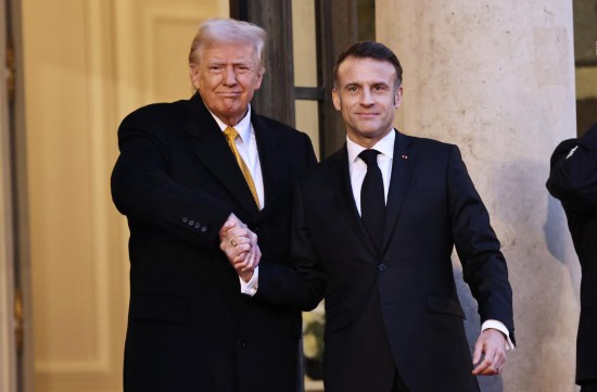 2024年12月7日,法国总统马克龙(左)正在巴黎爱丽舍宫欢送受邀出席巴黎圣母院从头典礼的美国被选总统特朗普。记者高静摄。