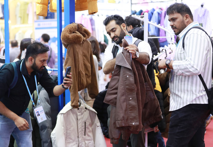2025年5月1日,正在广州揭幕的第137届广交会第三期上,境外采购商正在一家服拆企业的展区拍摄样品。记者 王瑞平 摄。